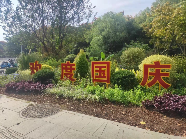 樂山路和夢都大街的東南角節(jié)點(diǎn)是新增加的花境景觀,使用了完美冬青、迷迭香、金葉蕕等二十多個草花品種,錯落有致的草花搭配和花境中豎起的“歡度國慶”標(biāo)語牌,烘托出熱烈的節(jié)日氣氛。