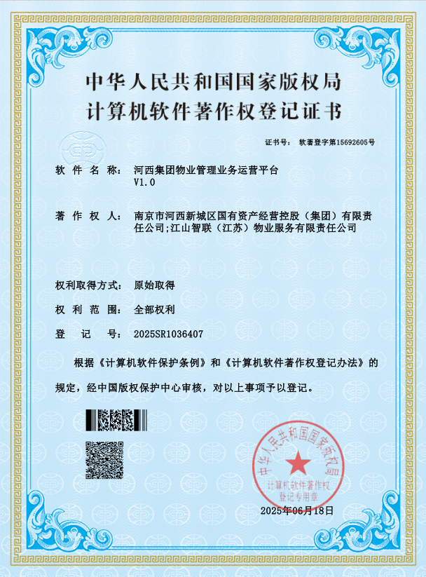 近日,河西集團(tuán)物業(yè)管理業(yè)務(wù)運(yùn)營(yíng)平臺(tái)成功獲得中華人民共和國(guó)國(guó)家版權(quán)局頒發(fā)的《計(jì)算機(jī)軟件著作權(quán)登記證書(shū)》。
