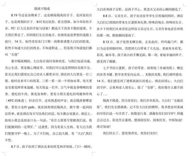 集中醫(yī)學(xué)觀察即將結(jié)束前,酒店工作人員收到了一份飽含深情的離別“禮物”。這是一封來(lái)自剛剛結(jié)束觀察生活、離開酒店順利歸家的市民朋友的感謝信,他用樸實(shí)真摯的語(yǔ)言回顧了與家人在酒店里生活的點(diǎn)點(diǎn)滴滴,表達(dá)了對(duì)集中觀察點(diǎn)指揮部、各工作組及國(guó)青酒店的感謝與祝福。