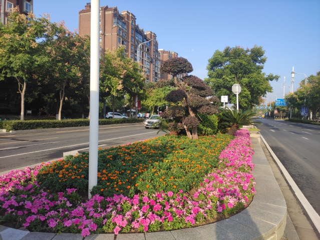 水韻路中分帶的花球也換上了新裝,10個巨大的牽?;ㄇ虮患t黃色的花帶簇?fù)碇?,在太陽下盡情地綻放著,像是小孩的笑臉,歡快地為祖國母親慶生。