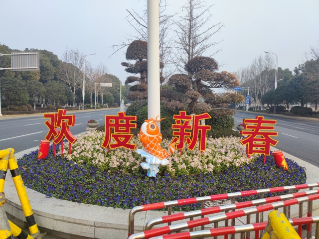 江蘇大劇院北門夢都大街中分帶,喬木造型樹下,鋪滿粉色紫羅蘭和紫色三角堇花卉,冷暖色系進行搭配分外醒目。錦鯉爆竹元素小品和歡度新春字牌,既簡約大氣又凸顯了紅紅火火迎新春的歡樂氣息。