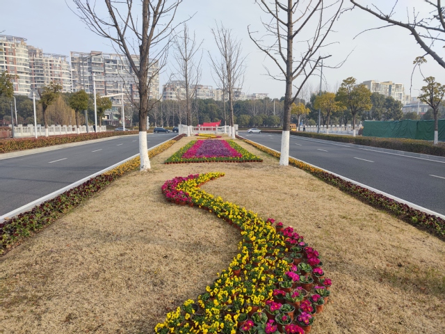 江蘇大劇院水韻路中分帶的花球也換上了新裝。10個巨大的羽衣甘藍花球被粉色的報春花和紅黃顏色角堇組成的花帶簇擁著,與兩邊的直線橙色花邊、方形花卉矩陣流線型花帶一起構成了一幅色彩斑斕、氣勢恢宏的絢麗畫卷,不但為兩會烘托出莊嚴隆重的氛圍,也洋溢著春節(jié)喜慶的氣氛