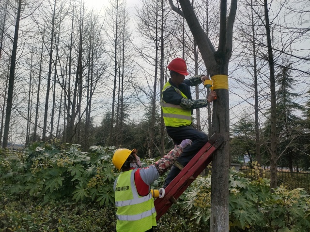這項舉措不僅可以大大降低綠化養(yǎng)護成本,并且還不存在農藥殘留,不污染環(huán)境。目前公司綠化養(yǎng)護人員已經對嗇園路83株欒樹、蒼山路的20余株紫葉李進行了膠帶黏蟲實驗,后期公司將持續(xù)進行觀察,來檢驗其防治效果,為后期開展病蟲害防治提供寶貴的科學依據。