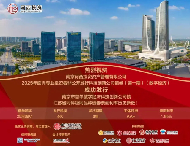 12月15日,河西集團南京河西投資資產管理有限公司(以下簡稱“河西投資”)2025年面向專業(yè)投資者非公開發(fā)行科技創(chuàng)新公司債券(第一期)(數(shù)字經濟)于上海證券交易所成功發(fā)行,系河西投資在債券市場的首次亮相。本次債券發(fā)行期限為3年,規(guī)模4億元,利率1.95%,為江蘇省同評級同品種債券票面利率歷史新低。